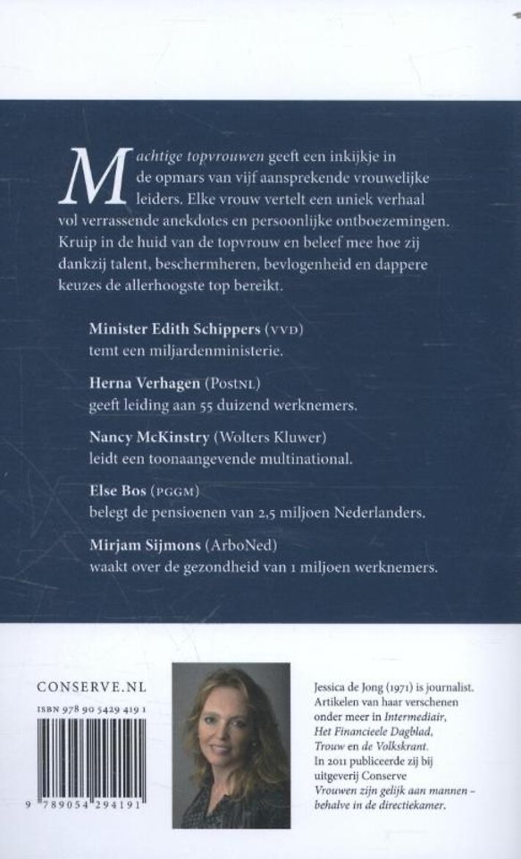 Meer over Jessica de Jong'Machtige topvrouwen - Vijf inspirerende voorbeelden' geeft een inkijkje in de opmars van vijf aansprekende vrouwelijke leiders. Elke vrouw vertelt een uniek verhaal vol verrassende anekdotes en persoonlijke ontboezemingen. Kruip in de huid van de topvrouw en beleef mee hoe zij dankzij talent, beschermheren, bevlogenheid en dappere keuzes de allerhoogste top bereikt.