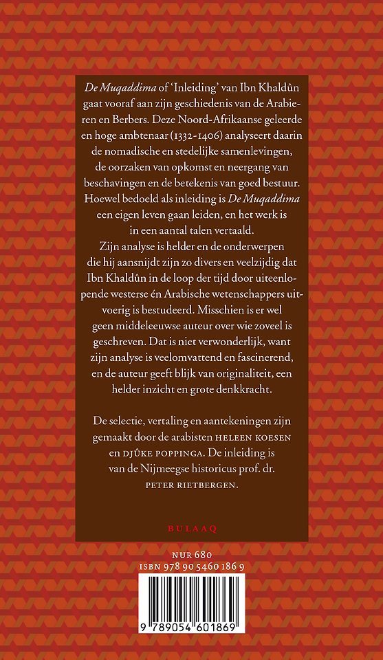 De Muqaddima of inleiding op Het boek der voorbeelden is in de tweede helft van de veertiende eeuw geschreven door de Noord-Afrikaanse historicus, geschiedfilosoof en hoge ambtenaar Ibn Khaldûn (1332-1406). Het bevat tal van beschrijvingen van de nomadische en stedelijke samenlevingen, met als doel algemene wetmatigheden te onderkennen in de geschiedenis. Dit werk heeft de auteur oorspronkelijk opgezet als een inleiding op de geschiedenis van Arabieren, Berbers en andere volken rond de Middellandse Zee, maar het is een eigen leven gaan leiden, als een afgeronde, kritische verhandeling over de sociale en historische processen die aan het menselijk bedrijf ten grondslag liggen. De analyse is zo helder en veelzijdig dat de auteur in de loop der tijd door uiteenlopende wetenschappers in het Westen is ingelijfd als filosoof, socioloog, econoom en demograaf, en bijna steeds met de toevoeging ‘vader van…’ of ‘eerste…’. En het is misschien nog allemaal waar ook, want zijn analyse van de geschiedenis is heel veelomvattend en fascinerend. Ibn Khaldûn geeft blijk van helder inzicht, grote denkkracht en originaliteit.
