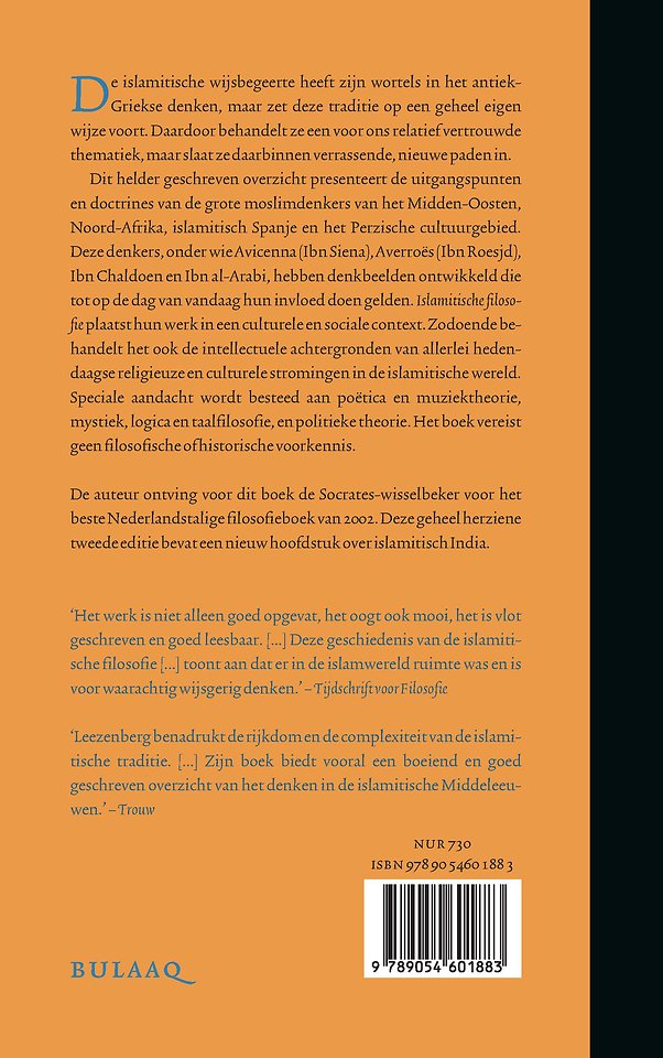 Dit helder geschreven overzicht presenteert de uitgangspunten en doctrines van de grote moslimdenkers van het Midden-Oosten, Noord-Afrika, islamitisch Spanje en het Perzische cultuurgebied. Deze denkers, onder wie Avicenna (Ibn Siena), Averroës (Ibn Roesjd), Ibn Chaldoen en Ibn al-Arabi, hebben denkbeelden ontwikkeld die tot op de dag van vandaag hun invloed doen gelden. Islamitische filosofie plaatst hun werk in een culturele en sociale context. Zodoende behandelt het ook de intellectuele achtergronden van allerlei hedendaagse religieuze en culturele stromingen in de islamitische wereld. Speciale aandacht wordt besteed aan poëtica en muziektheorie, mystiek, logica en taalfilosofie, en politieke theorie. Het boek vereist geen filosofische of historische voorkennis.