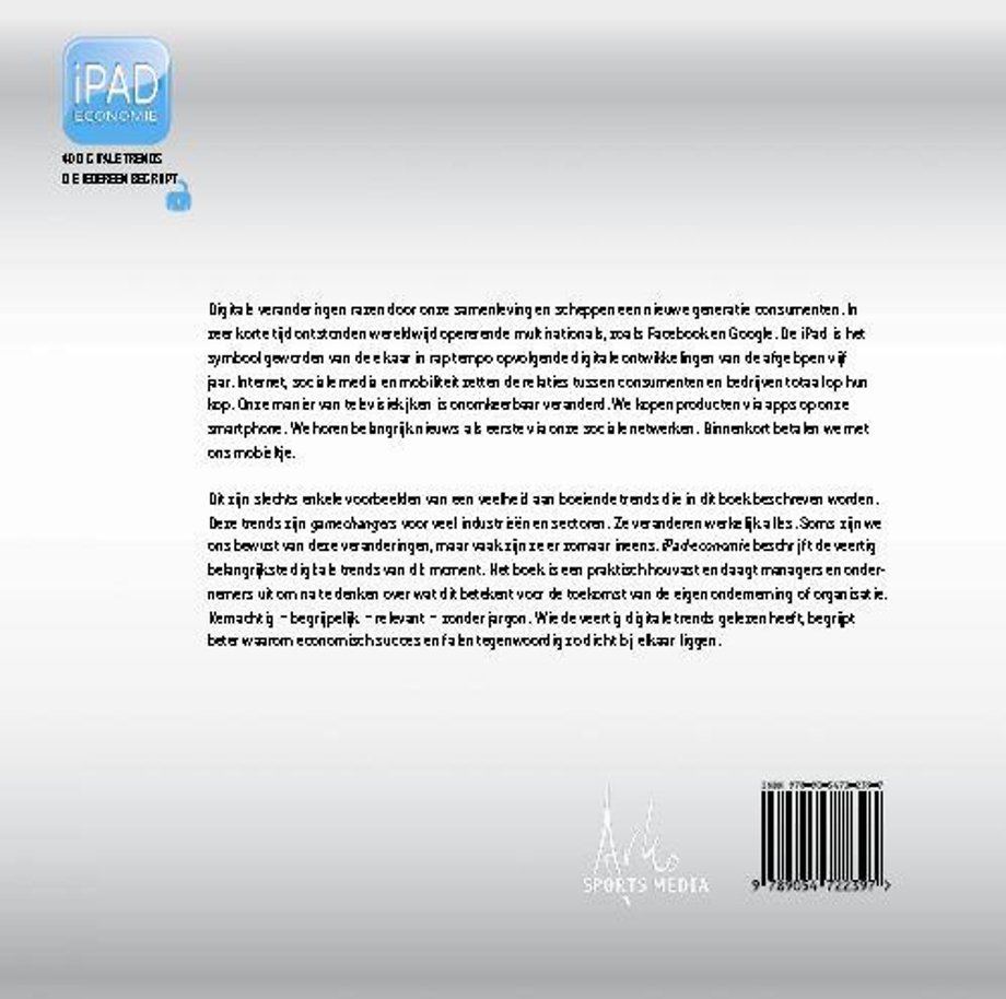 Dit zijn slechts enkele voorbeelden van een veelheid aan boeiende trends die in dit boek beschreven worden. Deze trends zijn gamechangers voor veel industrieën en sectoren. Ze veranderen werkelijk alles. Soms zijn we ons bewust van deze veranderingen, maar vaak zijn ze er zomaar ineens. 'iPad-economie' beschrijft de veertig belangrijkste digitale trends van dit moment. Het boek is een praktisch houvast en daagt managers en ondernemers uit om na te denken over wat dit betekent voor de toekomst van de eigen onderneming of organisatie.