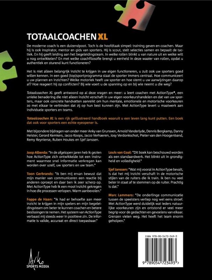 'Totaalcoachen XL' geeft antwoord op al deze vragen en meer: u leert coachen met ActionType®, een unieke benadering die niet alleen inzicht verschaft in uw eigen voorkeurshandelen en dat van uw spor- ters, maar ook concrete handvatten aanreikt om hun mentale, emotionele en motorische voorkeuren zo met elkaar te verbinden dat zij op hun best kunnen zijn. Met ActionType levert u maatwerk aan individuele sporters en teams.