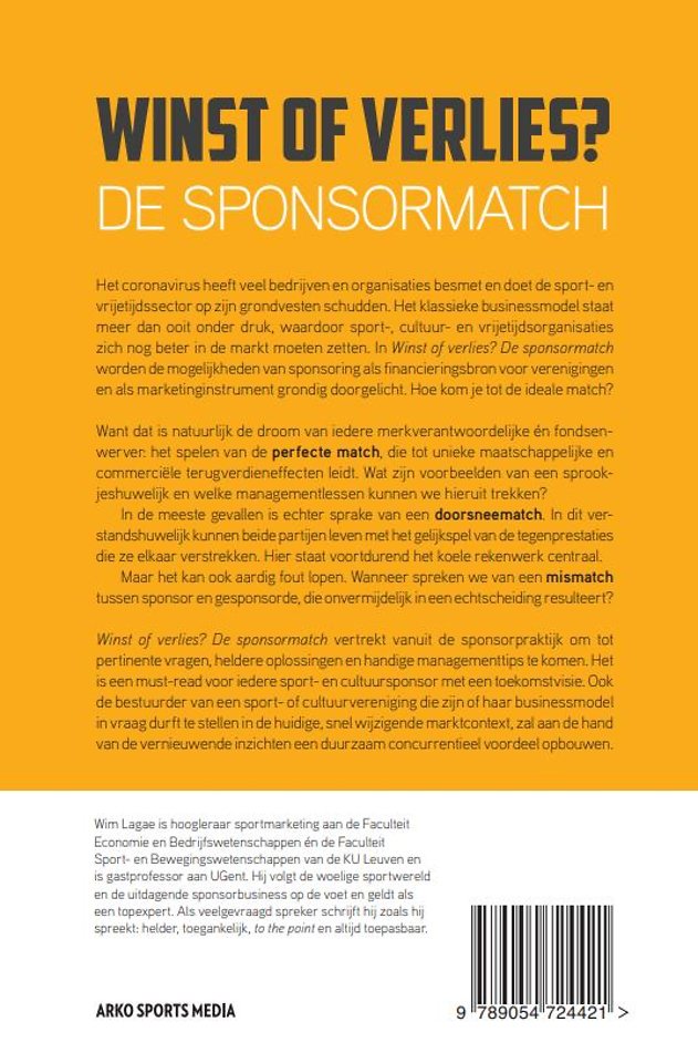Winst of verlies? De sponsormatch vertrekt vanuit de sponsorpraktijk om tot pertinente vragen, heldere oplossingen en handige managementtips te komen. Het is een must-read voor iedere sport- en cultuursponsor met een toekomstvisie. Ook de bestuurder van een sport- of cultuurvereniging die zijn of haar businessmodel in vraag durft te stellen in de huidige, snel wijzigende marktcontext, zal aan de hand van de vernieuwende inzichten een duurzaam concurrentieel voordeel opbouwen.