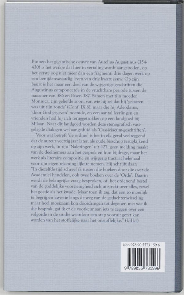 Voor wat betreft 'de ordine' is het in elk geval veelzeggend, dat de auteur veertig jaar later, als oude bisschop terugkijkend op zijn werk, in zijn 'Nalezingen' uit 427, geen melding maakt van de deelnemers aan het gesprek en hun bijdrage, maar het werk als literaire compositie en wijsgerig tractaat helemaal voor zijn eigen rekening lijkt te nemen. Hij schrijft daar: