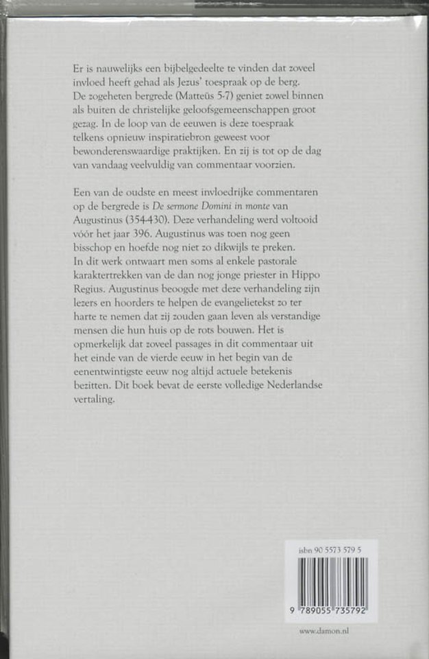 'De Bergrede (Mattheüs 5 t/m 7) behoort tot de bekendste gedeelten uit de Bijbel. Eén van de oudste en meest invloedrijke commentaren op de Bergrede is De sermone Domini in monte van Augustinus. Augustinus heeft bij zijn uitleg van de Bergrede gebruik gemaakt van het commentaar van Ambrosius op het evangelie van Lukas. Daarnaast vinden we ook opvattingen van de Griekse kerkvader Gregorius van Nyssa terug. Bij uitgeverij Damon verscheen voor het eerst een volledige Nederlandse vertaling van dit werk. Deze vertaling kwam tot stand onder supervisie van het Augustijns Instituut te Eindhoven en is het werk van Leo Wenneker en Hans van Reisen. In het feit dat de auteurs bijbelteksten veelal in de Willibrord-vertaling weergeven blijkt dat zij van rooms-katholieke huize zijn. Augustinus zelf citeerde of de Vulgatha of oudere Latijnse vertaling; vertalingen die vaak aanmerkelijk van de Hebreeuwse of Griekse grondtekst verschilden. Augustinus schreef dit werk nog voordat hij bisschop was. Uit dit commentaar blijkt zijn diepe begeerte dat mensen als een wijze bouwer een levenshuis op de rots bouwen. Dat maakt de blijvende actualiteit van dit werk duidelijk.'