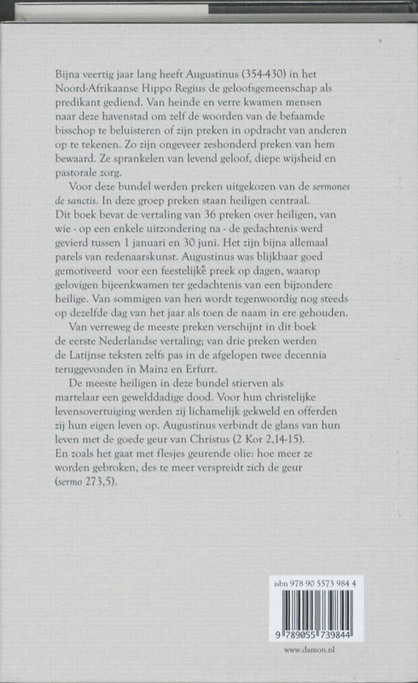 Voor deze bundel werden preken uitgekozen van de sermones de sanctis. In deze groep preken staan heiligen centraal. Dit boek bevat de vertaling van 36 preken over heiligen, van wie - op een enkele uitzondering na - de gedachtenis werd gevierd tussen 1 januari en 30 juni. Het zijn bijna allemaal parels van redenaarskunst. Augustinus was blijkbaar goed gemotiveerd  voor een feestelijke preek op dagen, waarop gelovigen bijeenkwamen ter gedachtenis van een bijzondere heilige. Van sommigen van hen wordt tegenwoordig nog steeds op dezelfde dag van het jaar als toen de naam in ere gehouden.