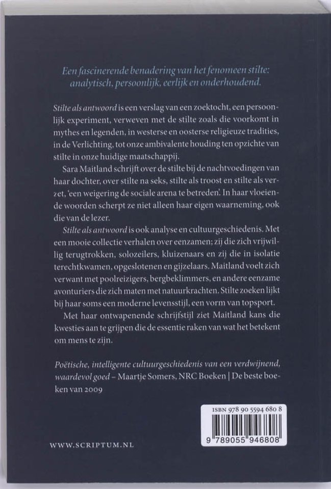 'Stilte als antwoord' is ook analyse en cultuurgeschiedenis. Met een mooie collectie verhalen over eenzamen; zij die zich vrijwillig terugtrokken, solozeilers, kluizenaars en zij die in isolatie terechtkwamen, opgeslotenen en gijzelaars. Maitland voelt zich verwant met poolreizigers, bergbeklimmers, en andere eenzame avonturiers die zich maten met natuurkrachten. Stilte zoeken lijkt bij haar soms een moderne levensstijl, een vorm van topsport.