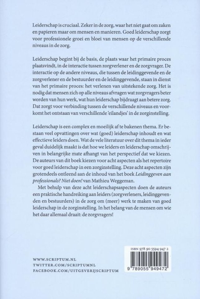 Leiderschap is een complex en moeilijk af te bakenen thema. Er bestaan veel opvattingen over wat (goed) leiderschap inhoudt en wat effectieve leiders doen. Wat de vele literatuur over dit thema in ieder geval duidelijk maakt is dat hoe we leiders en leiderschap omschrijven in belangrijke mate afhangt van het perspectief dat we kiezen. De auteurs van dit boek kiezen voor acht aspecten als het repertoire voor goed leiderschap in een zorginstelling. Deze acht aspecten zijn grotendeels ontleend aan de inhoud van het boek ‘Leidinggeven aan professionals? Niet doen!’ van Mathieu Weggeman.