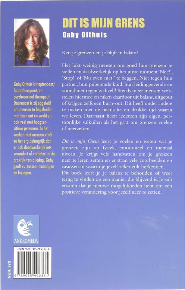 Meer over Gaby OlthuisHet lukt weinig mensen om goed hun grenzen te stellen en daadwerkelijk op het juiste moment 'Nee!', 'Stop!' of 'Nu even niet!' te zeggen. Niet tegen hun partner, hun puberende kind, hun leidinggevende en vooral niet tegen zichzelf! Steeds meer mensen worstelen hiermee en raken daardoor uit balans, uitgeput of krijgen zelfs een burn-out. Dit heeft onder andere te maken met de hectische en drukke tijd waarin we leven. Daarnaast heeft iedereen zijn eigen, persoonlijke valkuilen als het gaat om grenzen voelen of neerzetten.