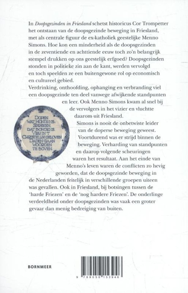In Doopsgezinden in Friesland schetst historicus Cor Trompetter het ontstaan van de doopsgezinde beweging in Friesland, met als centrale guur de ex-katholiek geestelijke Menno Simons. Hoe kon een minderheid als de doopsgezinden in de zeventiende en achttiende eeuw toch zo'n belangrijk stempel drukken op ons geestelijk erfgoed? Doopsgezinden stonden in politieke zin aan de kant, werden vervolgd en toch speelden ze een buitengewone rol op economisch en cultureel gebied.
