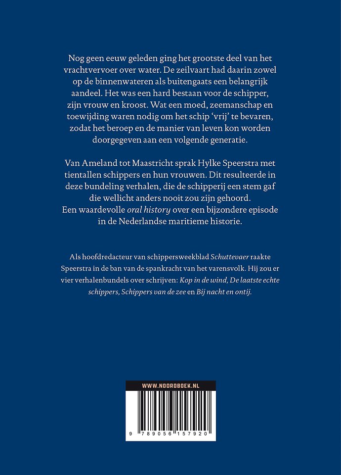 doorgegeven aan een volgende generatie. Van Ameland tot Maastricht sprak Hylke Speerstra met tientallen schippers en hun vrouwen. Dit resulteerde in deze bundeling verhalen, die de schipperij een stem gaf die wellicht anders nooit zou zijn gehoord. Een waardevolle oral history over een bijzondere episode in de Nederlandse maritieme historie.