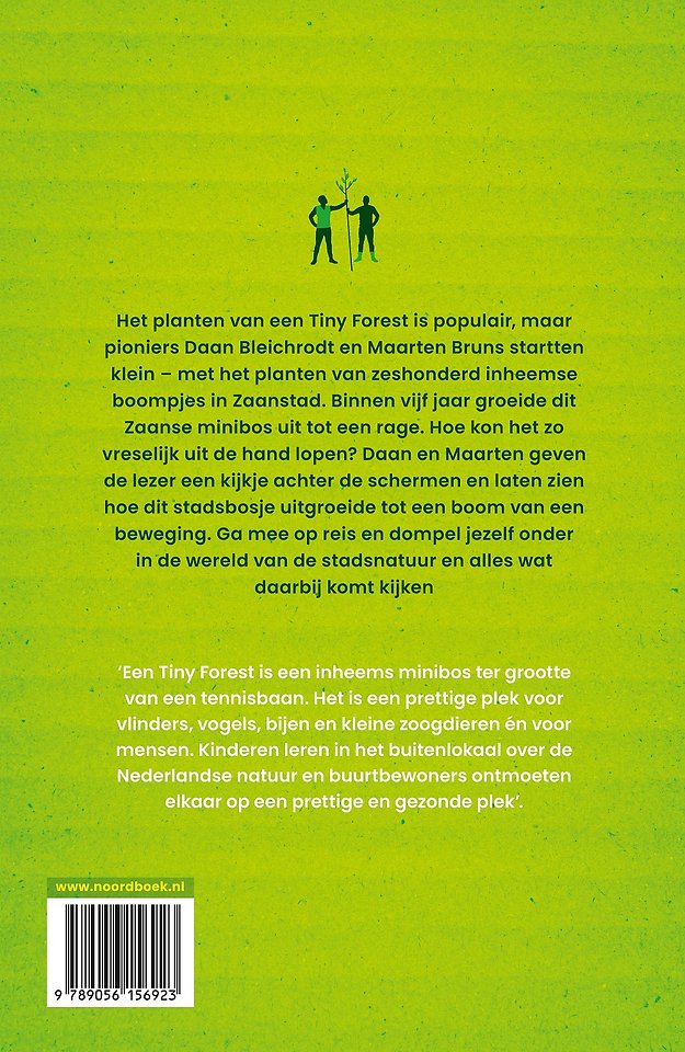 Het planten van een Tiny Forest is populair, maar pioniers Daan Bleichrodt en Maarten Bruns startten klein - met het planten van zeshonderd inheemse boompjes in Zaanstad. Binnen vijf jaar groeide dit Zaanse minibos uit tot een rage. Hoe kon het zo vreselijk uit de hand lopen? Daan en Maarten geven de lezer een kijkje achter de schermen en laten zien hoe dit stadsbosje uitgroeide tot een boom van een beweging. Ga mee op reis en dompel jezelf onder in de wereld van de stadsnatuur en alles wat daarbij komt kijken. 'Een Tiny Forest is een inheemse minibos ter grootte van een tennisbaan. Het is een prettige plek voor vlinders, vogels, bijen en kleine zoogdieren én voor mensen. Kinderen leren in het buitenlokaal over de Nederlandse natuur en buurtbewoners ontmoeten elkaar op een prettige en gezonde plek'.
