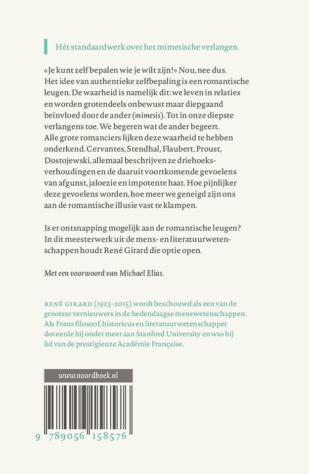 Alle grote romanciers lijken deze waarheid te hebben onderkend. Cervantes, Stendhal, Flaubert, Proust, Dostojewski, allemaal beschrijven ze driehoeksverhoudingen en de daaruit voortkomende gevoelens van afgunst, jaloezie en impotente haat. Hoe pijnlijker deze gevoelens worden, hoe meer we geneigd zijn ons aan de romantische illusie vast te klampen. Is er ontsnapping mogelijk aan de romaneske leugen? In dit meesterwerk uit de mens- en literatuurwetenschappen houdt de Franse cultuurfilosoof René Girard die optie open. Misschien wel. De grote romanciers wijzen een weg.