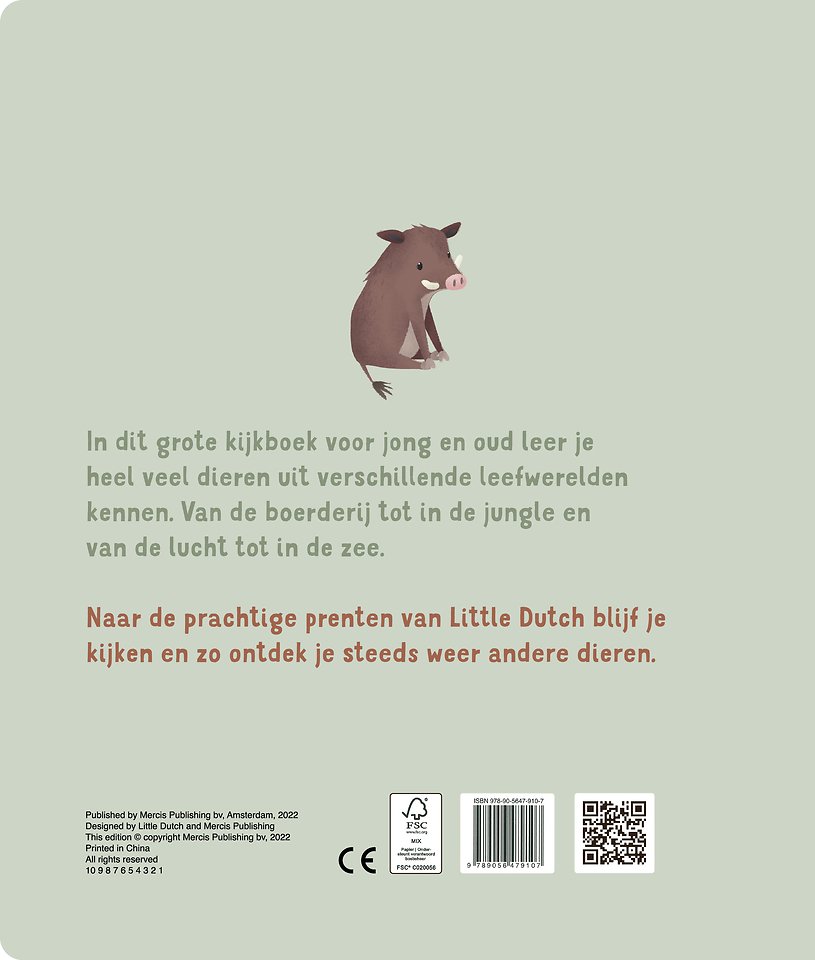 In dit grote kijkboek voor jong en oud leer je heel veel dieren uit verschillende leefwerelden kennen. Van het bos tot in de jungle en van de lucht tot in de zee. Naar de prachtige prenten van Little Dutch blijf je kijken en zo ontdek je steeds weer andere dieren. Een perfect kraamcadeauboek om jarenlang van te blijven genieten. Fijn om te geven en om te krijgen.