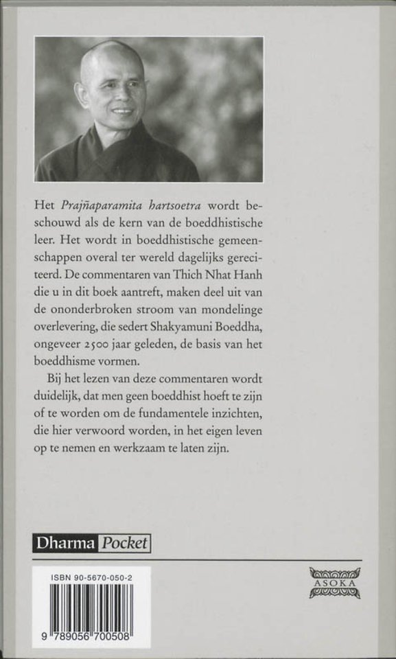 Het Prajna–aparamita hartsoetra wordt beschouwd als de kern van de boeddhistische leer. Het wordt in boeddhistische gemeenschappen overal ter wereld dagelijks gereciteerd. De commentaren van Thich Nhat Hanh die u in dit boek aantreft, maken deel uit van de ononderbroken stroom van mondelinge overlevering, die sedert Shakyamuni Boeddha, ongeveer 2500 jaar geleden, de basis van het boeddhisme vormen.