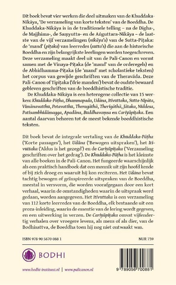 Dit boek bevat de integrale vertaling van de Khuddaka-Patha ('Korte passages'), het Udana ('Bewogen uitspraken'), het Itivuttaka ('Aldus is het gezegd') en de Cariyapitaka ('Verzameling geschriften over het gedrag'). De Khuddaka-Patha is het kleinste van alle boeken in de Pali-Canon. Het fungeerde waarschijnlijk als een praktisch handboek dat een monnik uit zijn hoofd kende of bij zich droeg en waaruit hij kon reciteren. Het Udana bevat tachtig bewogen of geïnspireerde uitspraken van de Boeddha, meestal in versvorm, die worden voorafgegaan door een kort verhaal, waarin de omstandigheden waarin de uitspraak werd gedaan, worden aangegeven. Het Itivuttaka is een verzameling van 112 korte leerredes van de Boeddha, elk bestaande uit een proza-inleiding, waarin de essentie van de lering wordt gegeven, en een uitwerking in verzen. De Cariyapitaka omvat vijfendertig verhalen over vroegere levens, als mens of als dier, van de Bodhisattva, de Boeddha toen hij nog niet ontwaakt was.