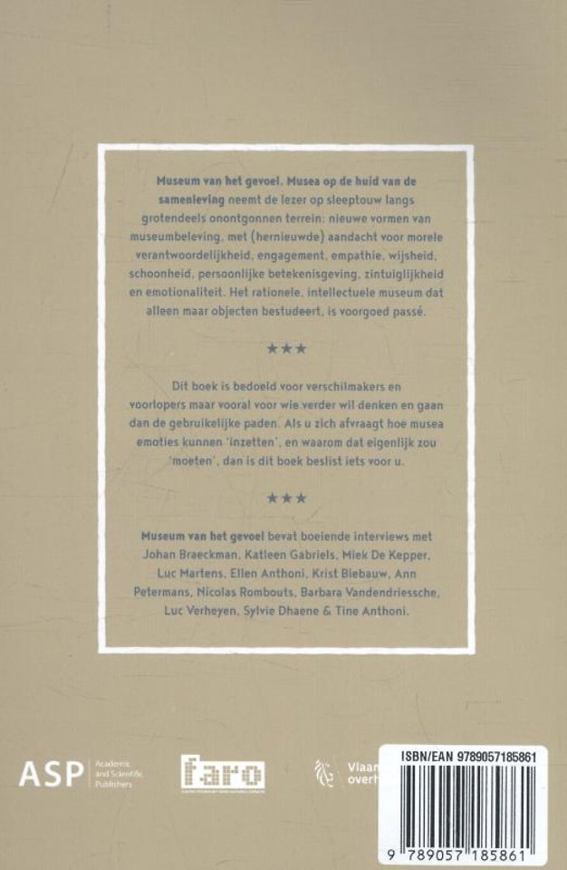 Museum van het gevoel. Musea op de huid van de samenleving neemt de lezer op sleeptouw langs grotendeels onontgonnen terrein: nieuwe vormen van museumbeleving, met (hernieuwde) aandacht voor morele verantwoordelijkheid, engagement, empathie, wijsheid, schoonheid, persoonlijke betekenisgeving, zintuiglijkheid en emotionaliteit. Het rationele, intellectuele museum dat
