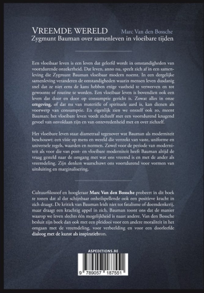 Cultuurfilosoof en hoogleraar Marc Van den Bossche probeert in dit boek te tonen dat al dat schijnbaar onheilspellende ook een positieve kracht in zich draagt. De kritiek van Bauman leidt niet tot fatalisme of doemdenkerij, maar draagt een krachtig appel in zich. Bauman toont ons dat de manier waarop we leven slechts één mogelijkheid is naast andere. Van den Bossche besluit zijn boek dan ook met een pleidooi voor een andere moraliteit in het omgaan met de vreemdeling, voor verbeelding en voor een doorleefde dialoog met de kunst als inspiratiebron.