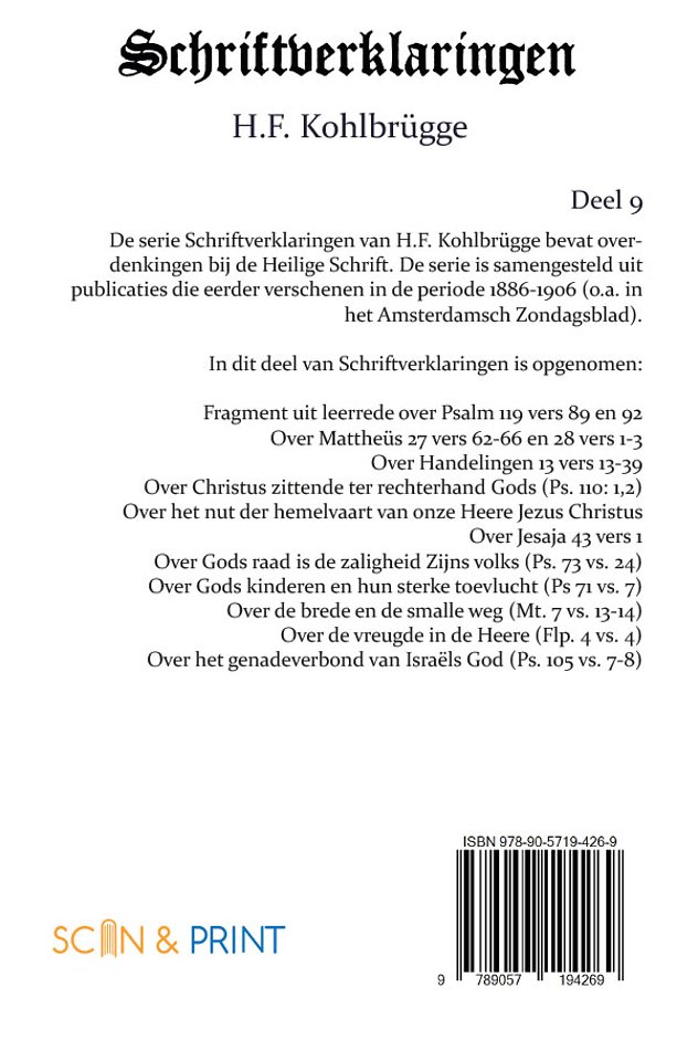 De serie Schriftverklaringen van H.F. Kohlbrügge bevat overdenkingen bij de Heilige Schrift. De serie is samengesteld uit publicaties die eerder verschenen in de periode 1886-1906 (o.a. in het Amsterdamsch Zondagsblad).