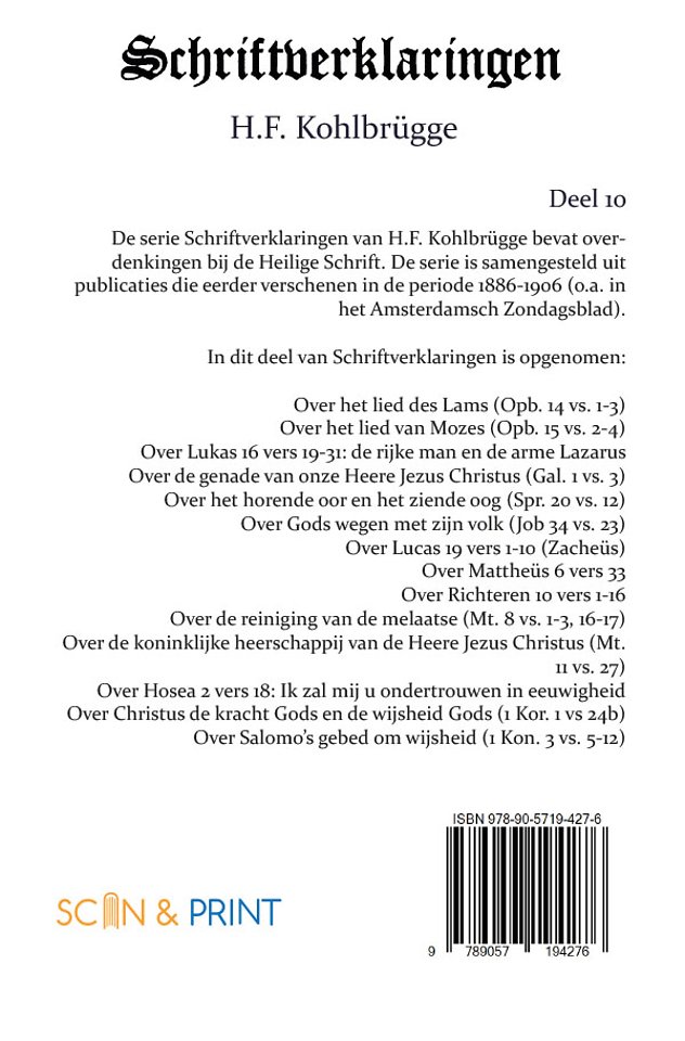 De serie Schriftverklaringen van H.F. Kohlbrügge bevat overdenkingen bij de Heilige Schrift. De serie is samengesteld uit publicaties die eerder verschenen in de periode 1886-1906 (o.a. in het Amsterdamsch Zondagsblad).