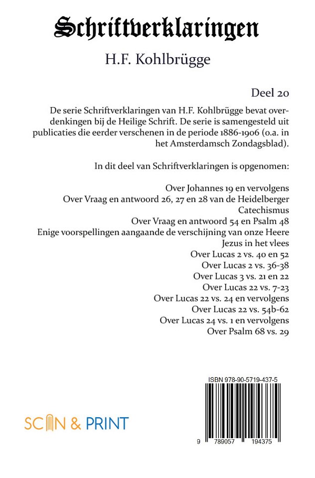 De serie Schriftverklaringen van H.F. Kohlbrügge bevat overdenkingen bij de Heilige Schrift. De serie is samengesteld uit publicaties die eerder verschenen in de periode 1886-1906 (o.a. in het Amsterdamsch Zondagsblad).