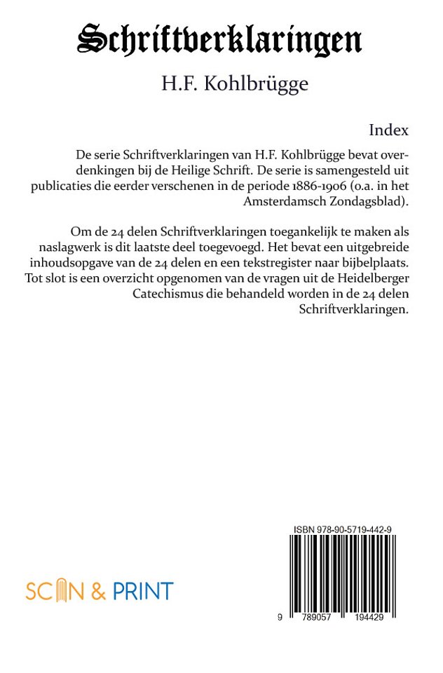 De serie Schriftverklaringen van H.F. Kohlbrügge bevat overdenkingen bij de Heilige Schrift. De serie is samengesteld uit publicaties die eerder verschenen in de periode 1886-1906 (o.a. in het Amsterdamsch Zondagsblad).