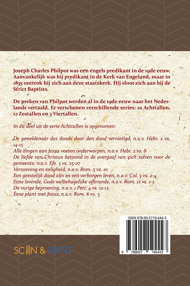 De preken van Philpot werden al in de 19de eeuw naar het Nederlands vertaald. Er verschenen verschillende series: 10 Achttallen, 12 Zestallen en 3 Viertallen.