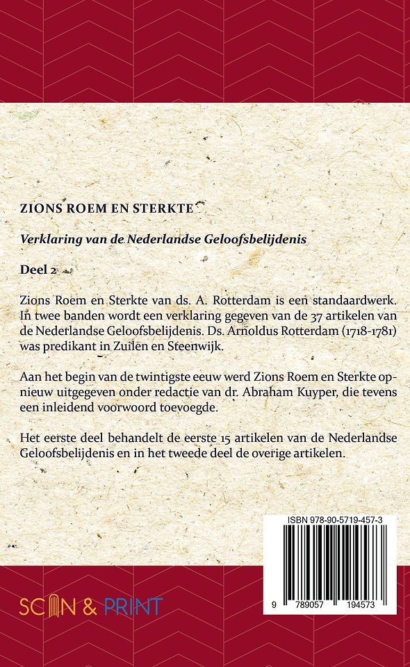 Zions Roem en Sterkte van ds. A. Rotterdam is een standaardwerk. In twee banden wordt een verklaring gegeven van de 37 artikelen van de Nederlandse Geloofsbelijdenis. Ds. Arnoldus Rotterdam (1718-1781) was predikant in Zuilen en Steenwijk.