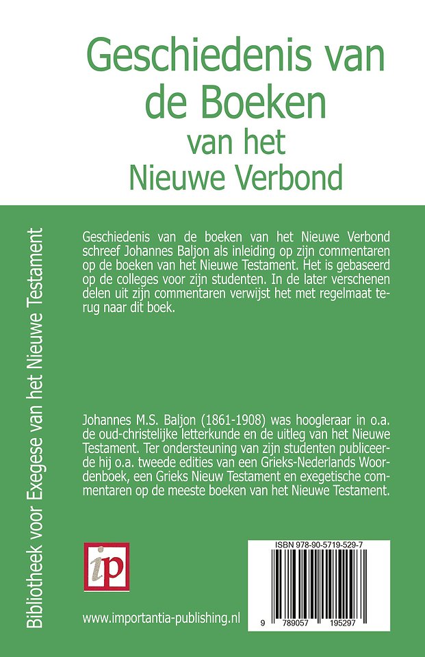 Johannes M.S. Baljon (1861-1908) was hoogleraar in o.a. de oud-christelijke letterkunde en de uitleg van het Nieuwe Testament. Ter ondersteuning van zijn studenten publiceerde hij o.a. tweede edities van een Grieks-Nederlands Woordenboek, een Grieks Nieuw Testament en exegetische commentaren op de meeste boeken van het Nieuwe Testament.