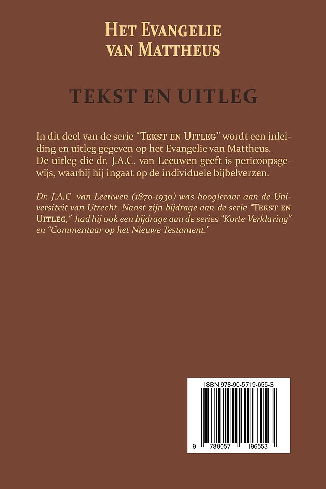 Dr. J.A.C. van Leeuwen (1870-1930) was hoogleraar aan de Universiteit van Utrecht. Naast zijn bijdrage aan de serie “Tekst en Uitleg,” had hij ook een bijdrage aan de series “Korte Verklaring” en “Commentaar op het Nieuwe Testament.”