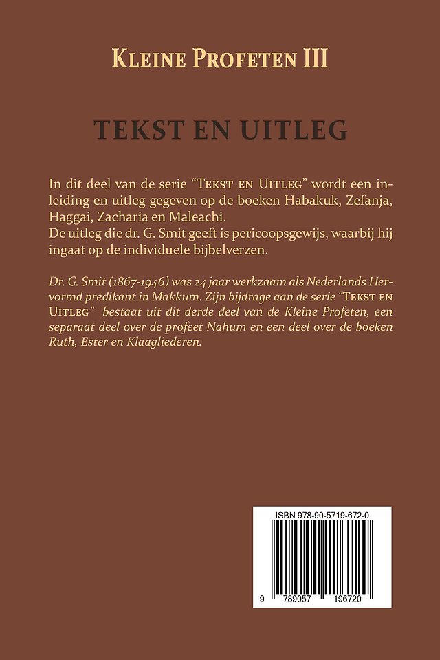 Dr. G. Smit (1867-1946) was 24 jaar werkzaam als Nederlands Hervormd predikant in Makkum. Zijn bijdrage aan de serie “Tekst en Uitleg” bestaat uit dit derde deel van de Kleine Profeten, een separaat deel over de profeet Nahum en een deel over de boeken Ruth, Ester en Klaagliederen.