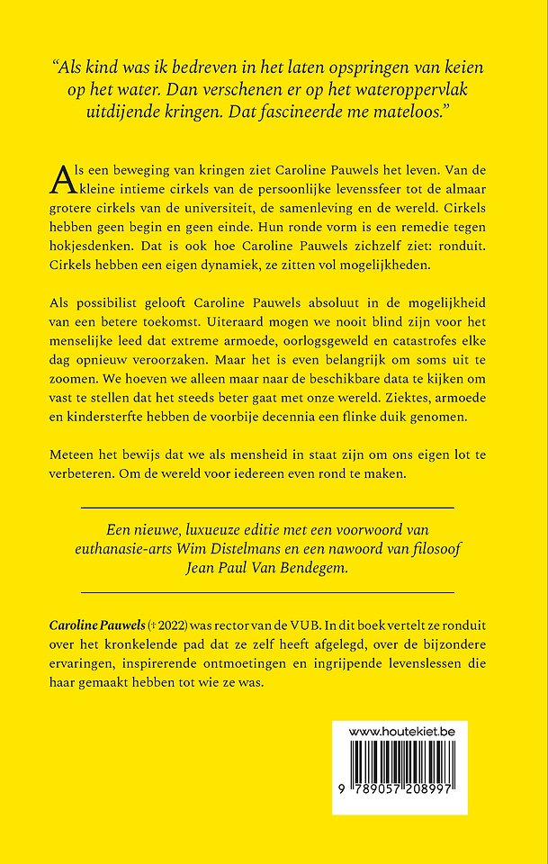 Als een beweging van kringen ziet Caroline Pauwels het leven. Van de kleine intieme cirkels van de persoonlijke levenssfeer tot de almaar grotere cirkels van de universiteit, de samenleving en de wereld. Cirkels hebben geen begin en geen einde. Hun ronde vorm is een remedie tegen hokjesdenken. Dat is ook hoe Caroline Pauwels zichzelf ziet: ronduit. Cirkels hebben een eigen dynamiek, ze zitten vol mogelijkheden.