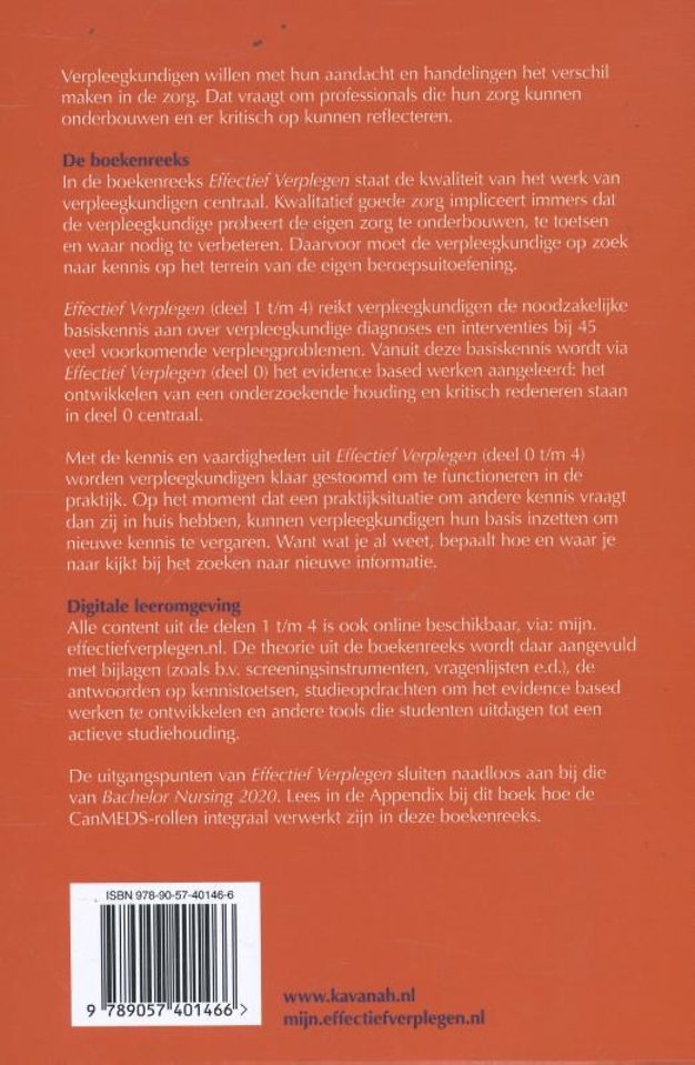 Het huidige onderwijs vraagt van verpleegkundigen het eigen handelen te beargumenteren met behulp van theoretische uitgangspunten en resultaten van wetenschappelijk onderzoek (evidence-based practice). Effectief verplegen reikt studenten de argumenten aan voor het oplossen van een aantal veel voorkomende verpleegproblemen, gebaseerd op de nieuwste inzichten. In dit boek zijn verpleegproblemen uitgewerkt, die zich bij veel verschillende patiënten/zorgvragers kunnen voordoen, gericht op de somatiek. Het boek opent met een inleiding over ebp, waarna de verpleegproblemen worden uitgewerkt. Elk hoofdstuk vormt een afgerond geheel, dat afzonderlijk bestudeerd kan worden. De hoofdstukindeling volgt een vast patroon: korte introductie, gevolgd door casuïstiek en een beschrijving van het probleemgebied, de verpleegkundige diagnostiek en de verpleegkundige interventies, met tot besluit een kennistoets en een literatuuroverzicht.