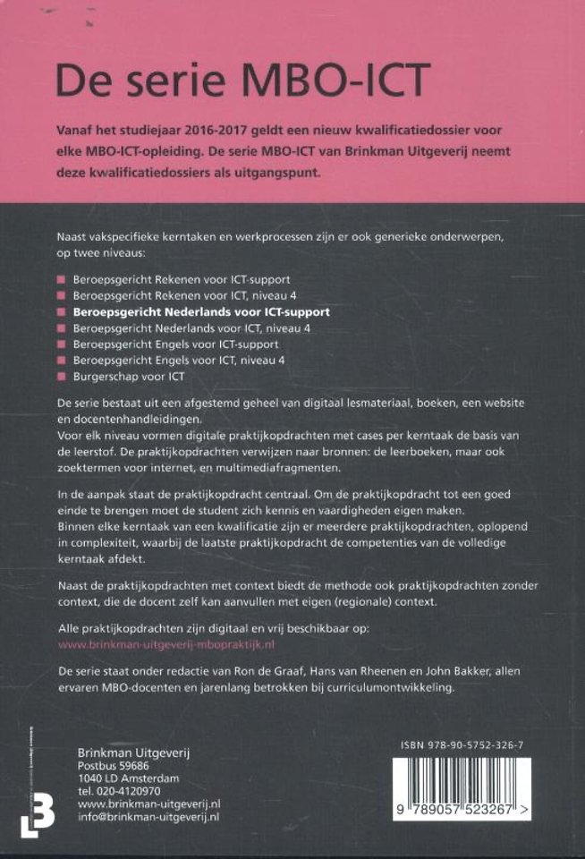Dit boek is bedoeld voor het beroepsgerichte Nederlands van de MBO-ICT-opleidingen Support (niveau 2 en 3). In het beroepsbeeld van de Medewerker ICT en de Medewerker beheer ICT komt schriftelijk taalgebruik beduidend minder voor dan mondeling taalgebruik. Dat beeld wordt dan ook weerspiegeld in dit boek.