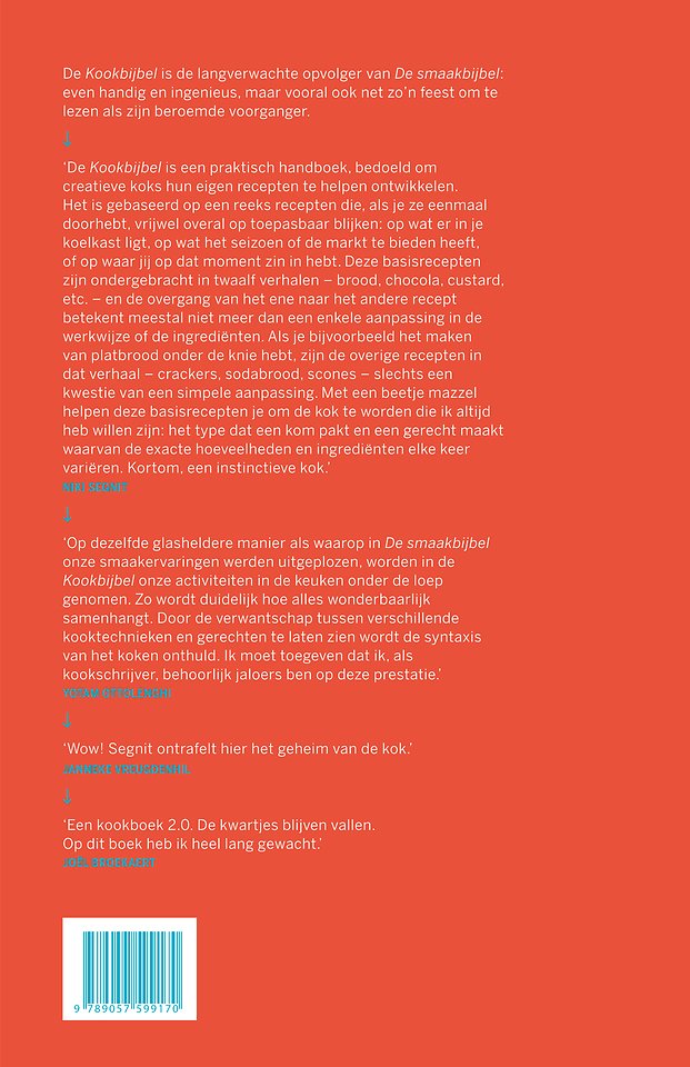 'De Kookbijbel' is een praktisch handboek, bedoeld om creatieve koks hun eigen recepten te helpen ontwikkelen. Het is gebaseerd op een reeks recepten die, als je ze eenmaal doorhebt, vrijwel overal op toepasbaar blijken: op wat er in je koelkast ligt, op wat het seizoen of de markt te bieden heeft, of op waar jij op dat moment zin in hebt. Deze basisrecepten zijn ondergebracht in twaalf verhalen – brood, chocola, custard, etc. – en de overgang van het ene naar het andere recept betekent meestal niet meer dan een enkele aanpassing in de werkwijze of de ingrediënten. Als je bijvoorbeeld het maken van platbrood onder de knie hebt, zijn de overige recepten in dat verhaal – crackers, sodabrood, scones – slechts een kwestie van een simpele aanpassing. Met een beetje mazzel helpen deze basisrecepten je om de kok te worden die ik altijd heb willen zijn: het type dat een kom pakt en een gerecht maakt waarvan de exacte hoeveelheden en ingrediënten elke keer variëren. Kortom, een instinctieve kok.’ - Niki Segnit