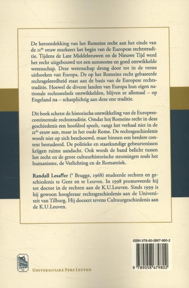 In dit boek schetst Randall Lesaffer de historische ontwikkeling van deze Europees-continentale rechtstraditie. Omdat het Romeins recht in deze geschiedenis een hoofdrol speelt, vangt het verhaal niet aan in de 11de eeuw maar in het oude Rome. De ontwikkeling van het recht wordt in een bredere context bestudeerd. Zo is er ruime aandacht voor politieke en staatkundige gebeurtenissen en wordt ook de relatie met cultuurhistorische stromingen zoals het humanisme, de Verlichting en de Romantiek belicht.