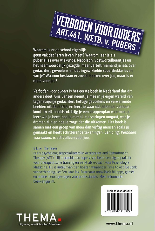 'Verboden voor ouders' is het eerste boek in Nederland dat hier verandering in brengt. Op een zeer persoonlijke manier neemt succesauteur Gijs Jansen je mee in de puberwereld van tegenstrijdige gedachten, heftige gevoelens en verwarrende beelden uit de media. In elk hoofdstuk krijg je een stappenplan waarmee je leert wie je bent, wat je dromen zijn en hoe je zorgt dat die uitkomen.