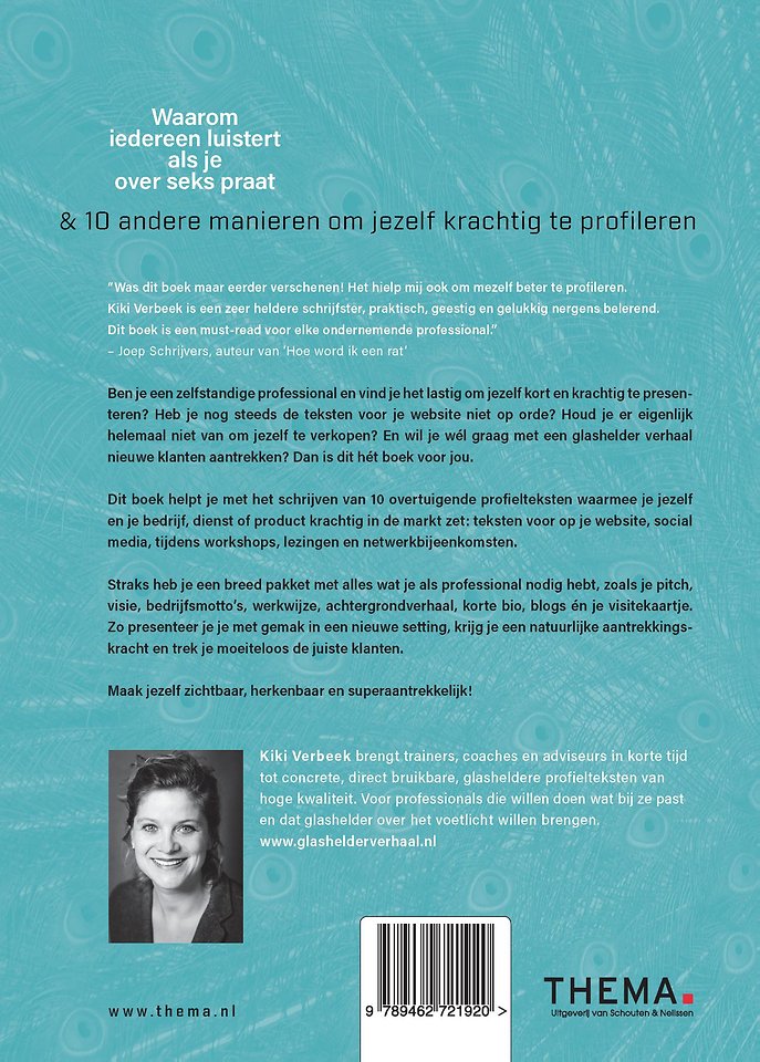 Meer over Kiki VerbeekBent u een zelfstandige professional en vindt u het lastig om uzelf kort en krachtig te presenteren? Heeft u nog steeds de teksten voor uw website niet op orde? Houdt u er eigenlijk helemaal niet van om uzelf te verkopen? En wilt u wél graag met een glashelder verhaal nieuwe klanten aantrekken? Dan is dit hét boek voor u.