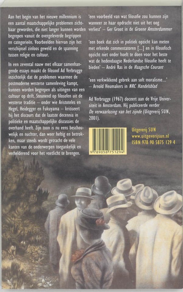 In een zevental nauw met elkaar samenhangende essays maakt de filosoof Ad Verbrugge inzichtelijk dat de problemen waarmee de postmoderne Westerse samenleving kampt, kunnen worden begrepen als uitingen van een cultuur op drift. Steunend op filosofen uit westerse traditie - onder wie Aristoteles en Hegel, Heidegger en Fukuyama - kritiseert hij het discours dat de laatste decennia in politieke en maatschappelijke discussies de overhand heeft. Zijn toon is nu eens beschouwelijk en nuchter, dan weer heftig en betrokken, maar steeds tracht hij de vele kanten van de onderwerpen toegankelijk en verhelderend voor het voetlicht te brengen