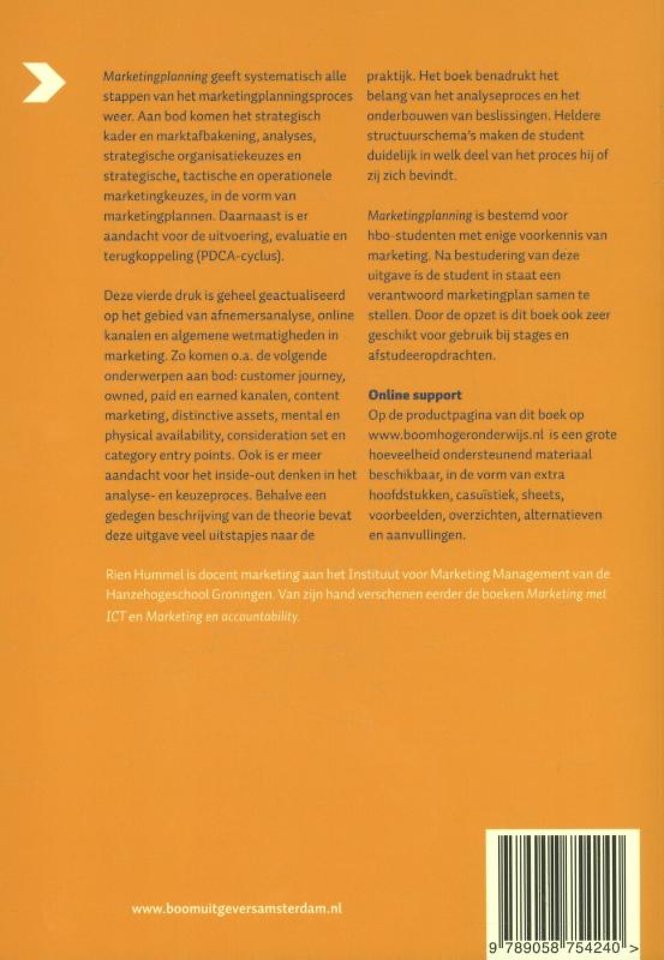Deze vierde druk is geheel geactualiseerd op het gebied van afnemersanalyse, online kanalen en algemene wetmatigheden in marketing. Zo komen o.a. de volgende onderwerpen aan bod: customer journey, owned, paid en earned kanalen, content marketing, distinctive assets, mental en physical availability, consideration set en category entry points. Ook is er meer aandacht voor het inside-out denken in het analyse- en keuzeproces. Behalve een gedegen beschrijving van de theorie bevat deze uitgave veel uitstapjes naar de praktijk. Het boek benadrukt het belang van het analyseproces en het onderbouwen van beslissingen. Heldere structuurschema's maken de student duidelijk in welk deel van het proces hij of zij zich bevindt.