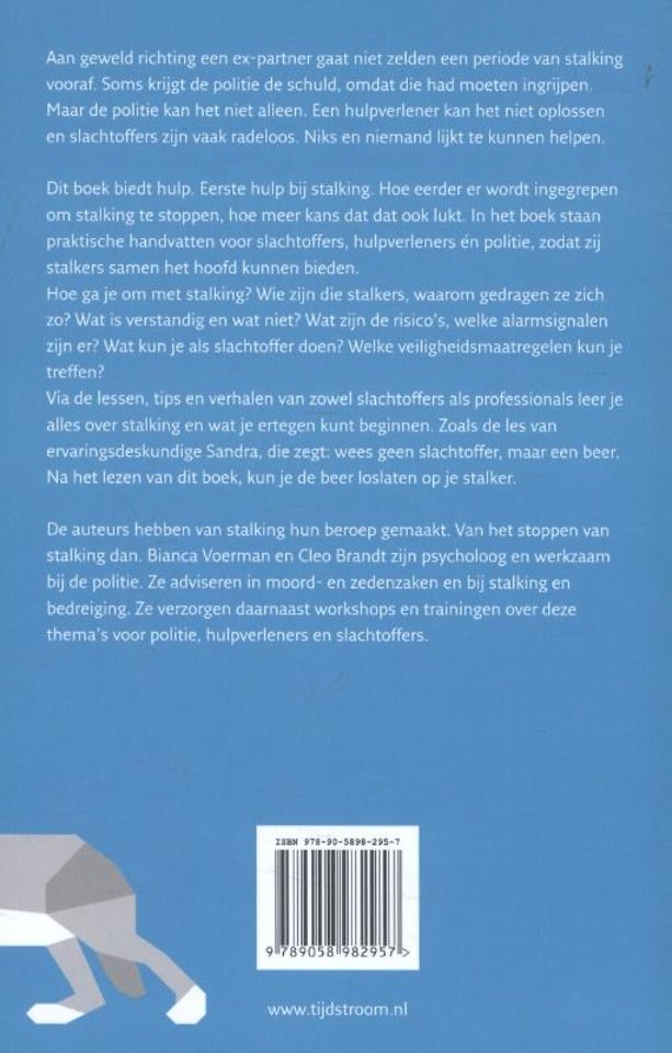 Via de lessen, tips en verhalen van zowel slachtoffers als professionals leer je alles over stalking en wat je ertegen kunt beginnen. Zoals de les van ervaringsdeskundige Sandra, die zegt: wees geen slachtoffer, maar een beer. Na het lezen van dit boek, kun je de beer loslaten op je stalker.