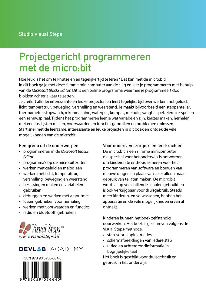 Je creëert allerlei interessante en leuke projecten en leert tegelijkertijd over werken met geluid, licht, temperatuur, beweging, versnelling en weerstand. Je maakt bijvoorbeeld een stappenteller, thermometer, stopwatch, rekenmachine, waterpas, kompas, melodie, vangbalspel, eierrace-spel en een zenuwspiraal. Tijdens het programmeren leer je wat variabelen zijn, keuzes maken, herhalen met een lus, lijsten maken, voorwaarden en functies gebruiken en problemen oplossen. Start snel met de leerzame, interessante en leuke projecten in dit boek en ontdek de vele mogelijkheden van de micro:bit!