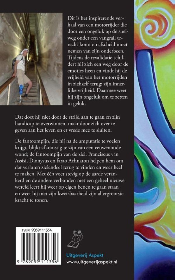 Dit is het inspirerende verhaal van een motorrijder die door een ongeluk op de snelweg onder een vangrail terecht komt en afscheid moet nemen van zijn onderbeen. Tijdens de revalidatie schildert hij zich een weg door de emoties heen en vindt hij de vrijheid van het motorrijden in zichzelf terug; zijn innerlijke vrijheid. Daarmee weet hij zijn ongeluk om te zetten in geluk. Dat doet hij niet door de strijd aan te gaan en zijn handicap te overwinnen, maar door zich over te geven aan het leven en er vrede mee te sluiten. De fantoompijn, die hij na de amputatie te voelen krijgt, blijkt afkomstig te zijn van een eeuwenoude wond; de fantoompijn van de ziel. Franciscus van Assisi, Dionysus en farao Achnaton helpen hem om dat verloren zielendeel terug te vinden en weer heel te maken. Met één voet stevig op de aarde verankerd en de andere verbonden met een geheel nieuwe wereld leert hij weer op eigen benen te gaan staan en weet hij met zijn kwetsbaarheid zijn allergrootste kracht te tonen.