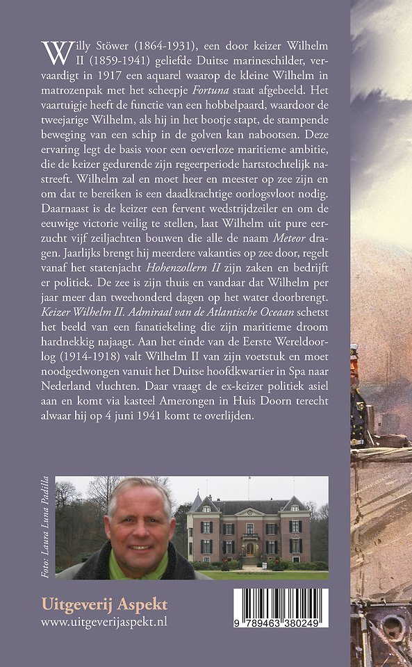 Willy Stöwer (1864-1931), een door keizer Wilhelm II (1859-1941) geliefde Duitse marineschilder, vervaardigt in 1917 een aquarel waarop de kleine Wilhelm in matrozenpak met het scheepje Fortuna staat afgebeeld. Het vaartuigje heeft de functie van een hobbelpaard, waardoor de tweejarige Wilhelm, als hij in het bootje stapt, de stampende beweging van een schip in de golven kan nabootsen. Deze ervaring legt de basis voor een oeverloze maritieme ambitie, die de keizer gedurende zijn regeerperiode hartstochtelijk nastreeft. Wilhelm zal en moet heer en meester op zee zijn en om dat te bereiken is een daadkrachtige oorlogsvloot nodig. Daarnaast is de keizer een fervent wedstrijdzeiler en om de eeuwige victorie veilig te stellen, laat Wilhelm uit pure eerzucht vijf zeiljachten bouwen die alle de naam Meteor dragen. Jaarlijks brengt hij meerdere vakanties op zee door, regelt vanaf het statenjacht Hohenzollern II zijn zaken en bedrijft er politiek. De zee is zijn thuis en vandaar dat Wilhelm per jaar meer dan tweehonderd dagen op het water doorbrengt. Keizer Wilhelm II. Admiraal van de Atlantische Oceaan schetst het beeld van een fanatiekeling die zijn maritieme droom hardnekkig najaagt. Aan het einde van de Eerste Wereldoorlog (1914-1918) valt Wilhelm II van zijn voetstuk en moet noodgedwongen vanuit het Duitse hoofdkwartier in Spa naar Nederland vluchten. Daar vraagt de ex-keizer politiek asiel aan en komt via kasteel Amerongen in Huis Doorn terecht alwaar hij op 4 juni 1941 komt te overlijden.