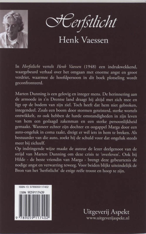 In Herfstlicht vertelt Henk Vaessen (1948) een indrukwekkend, waargebeurd verhaal over het omgaan met enorme angst en groot verdriet, waarmee de hoofdpersoon in dit boek plotseling wordt geconfronteerd.