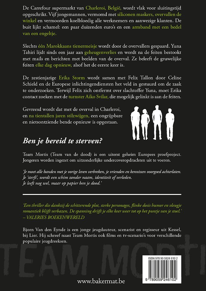 De Carrefour supermarkt van Charleroi, België, wordt vlak voor sluitingstijd opgeschrikt. Vijf jongemannen, vermomd met siliconen maskers, overvallen de winkel en vermoorden koelbloedig alle werknemers en aanwezige klanten. De buit lijkt schamel: een paar duizenden euro's en een armband met een bedel van een engeltje. Slechts één Marokkaans tienermeisje wordt door de overvallers gespaard. Yuna Tahiri lijdt sinds een jaar aan geheugenverlies en wordt na de feiten bestookt met mails en berichten met beelden van de overval. Ze beleeft de gruwelijke feiten elke dag opnieuw, alsof het de eerste keer is. De zestienjarige Erika Storm wordt samen met Felix Tallon door Celine Schield en de Europese inlichtingendiensten het veld in gestuurd om de zaak te onderzoeken. Terwijl Felix zich ontfermt over slachtoffer Yuna, moet Erika contact zoeken met de turnster Aiko Svilar, die mogelijk gelinkt is aan de feiten. Gevreesd wordt dat met de overval in Charleroi, en na tientallen jaren stilzwijgen, een ongrijpbare en nietsontziende bende opnieuw is opgestaan.