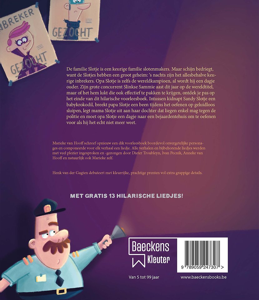 De familie Slotje is een keurige familie slotenmakers. Maar schijn bedriegt, want de Slotjes hebben een groot geheim: 's nachts zijn het allesbehalve keurige inbrekers. Opa Slotje is zelfs de wereldkampioen, al wordt hij een dagje ouder. Zijn grote concurrent Slinkse Sammie aast dit jaar op de wereldtitel, maar of het hem lukt die ook effectief te pakken te krijgen, ontdek je pas op het einde van dit hilarische voorleesboek. Intussen kidnapt Sandy Slotje een babykrokodil, breekt papa Slotje een been tijdens het oefenen op geluidloos sluipen, legt mama Slotje aan haar dochter uit dat liegen enkel mag tegen de politie en moet opa Slotjeeen dagje naar een bejaardentehuis om te oefenen voor als hij het echt niet meer weet. Marieke van Hooff schreef opnieuw een dik voorleesboek boordevol onvergetelijke personages en componeerde voor elk verhaal een liedje. Alle verhalen en bijbehorende liedjes werden met veel plezier ingesproken en -gezongen door Dieter Troubleyn, Ivan Pecnik, Anneke van Hooff en natuurlijk ook Marieke zelf. Henk van der Gugten debuteert met kleurrijke, prachtige prenten vol extra grappige details.
