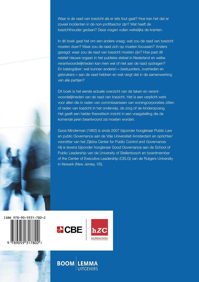 In dit boek gaat het om een andere vraag: wat zou de raad van toezicht moeten doen? Waar zou de raad zich op moeten focussen? Anders gezegd: waar zou de raad van toezicht moeten zijn? Hoe past dit relatief nieuwe orgaan in het publieke stelsel in Nederland en welke verantwoordelijkheden kan men wel of niet aan de raad opdragen? En belangrijker: wat kunnen anderen - bestuurders, overheden en gebruikers - aan de raad hebben en wat vergt dat in de samenwerking van alle partijen?