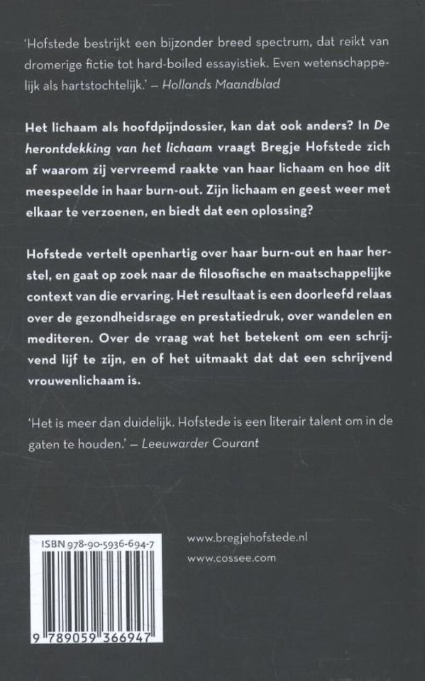 'Mijn lichaam was iets dat mijn hoofd ronddroeg, hinderlijk traag overigens, en mijn pen vasthield, een noodzakelijk kwaad.' In De herontdekking van het lichaam gaat Bregje Hofstede op zoek naar een antwoord op de vraag waarom zij zich vervreemd voelt van haar lichaam. Hoe heeft de breuk tussen lichaam en geest kunnen ontstaan? Hoe speelde die mee in de burn-out die ze op haar vierentwintigste kreeg? Hoe kun je schrijven met je lijf?