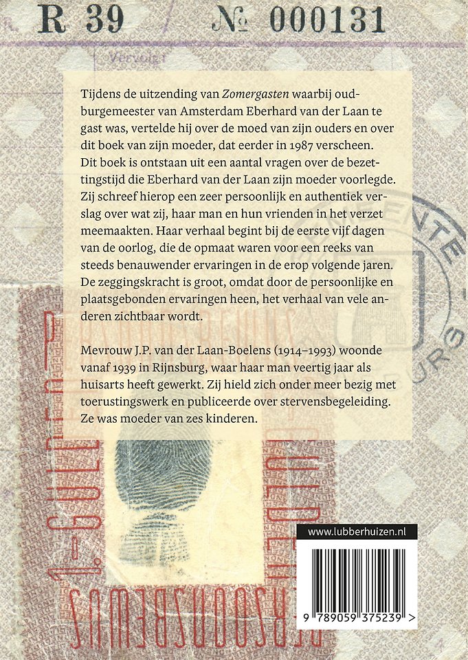 Dit boek is ontstaan uit een aantal vragen over de bezettingstijd die Eberhard van der Laan zijn moeder voorlegde. Zij schreef hierop een zeer persoonlijk en authentiek verslag over wat zij, haar man en hun vrienden in het verzet meemaakten. Haar verhaal begint bij de eerste vijf dagen van de oorlog, die de opmaat waren voor een reeks van steeds benauwender ervaringen in de erop volgende jaren. De zeggingskracht is groot, omdat door de persoonlijke en plaatsgebonden ervaringen heen, het verhaal van vele anderen zichtbaar wordt.