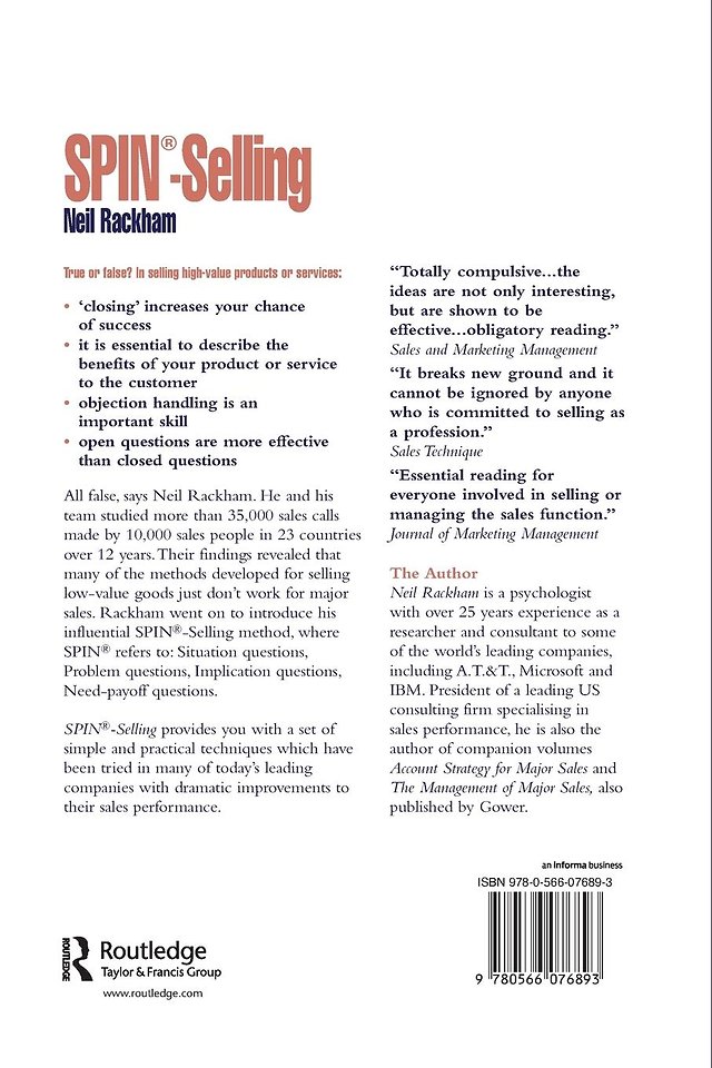 Twaalf jaar onderzoek heeft geleid tot de verkoopstrategie die bekend staat onder de naam SPIN: Situatie-, Probleem-, Implicatie- en Nuttig-effect-vragen. De SPIN-strategie wordt door veel van de beste verkopers ter wereld toegepast. Dit boek maakt deze makkelijk te gebruiken methode nu ook voor u toegankelijk. Neil Rackham helpt u SPIN in praktijk te brengen via duidelijke illustraties, praktijkvoorbeelden en informatieve casestudies.